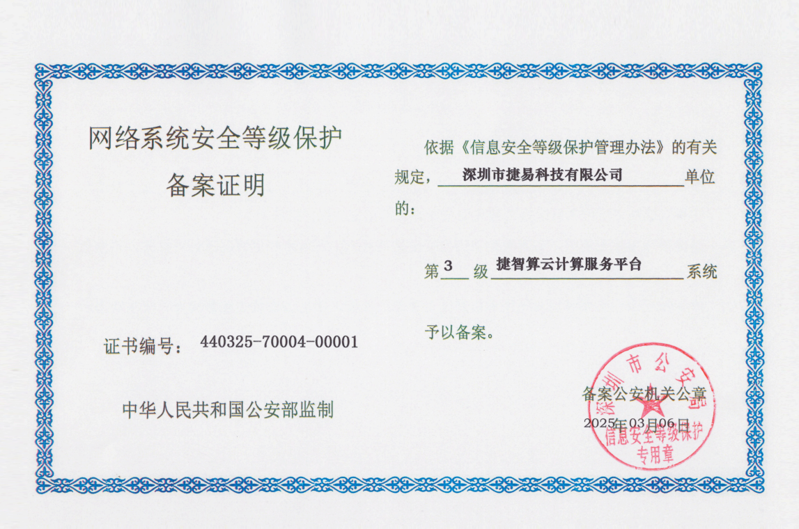 捷智算获得国家信息系统安全等级保护三级认证